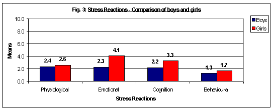 Table 1 and Figure 1 reveal that girls report more stress reactions (for all types of reactions) than boys. Themost significant difference between boys and girls is in Emotionaland Cognitive stress reactions.