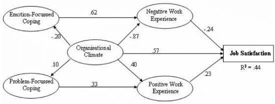 With regard to the former, in the context of officers critical incident work experiences, Burke and Paton (2006) examined the relationship between personal factors, organizational climate, positive and negative organizational experiences and job satisfaction in emergency responders (Figure 1). In addition to organizational climate having a direct effect on satisfaction, and thus on the meaning and benefit officers derive from or attribute to their work, the influence of culture was also mediated by positive and negative organizational experiences (measured using the Police Hassles and Uplifts Scale (Hart, Wearing, & Headey, 1994)), with positive experiences (uplifts) contributing to and negative experiences (hassles) detracting from satisfaction (Figure 1).