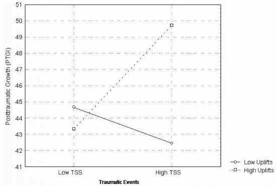 The relationship was not, however, a straightforward one. Rather, an interactive relationship between organizational uplifts and posttraumatic growth was evident, with the frequency of critical incident experience playing a significant role in this process. When officers experienced one traumatic events (Low TSS: n = 116, 37%), uplifts did not influence posttraumatic growth. However, for officers with high exposure (High TSS: 2 or more traumatic events; n = 148, 47%), uplifts had a significant effect on posttraumatic growth (Figure 2). As the number of critical incident experienced increased, the more important became the positive elements of organizational culture for officers well-being. The importance of increasing opportunities for officers to experience uplifts, given the high probability for multiple traumatic experiences, cannot be underestimated.