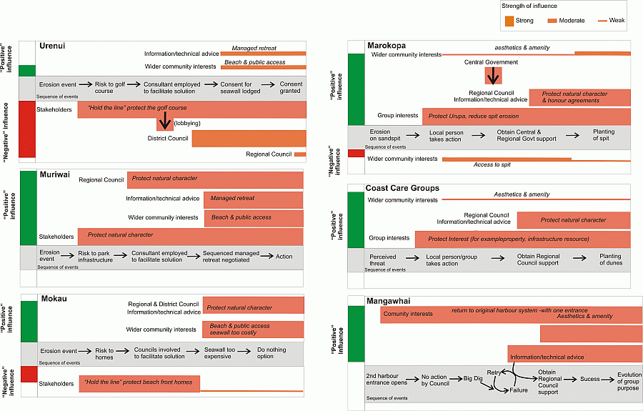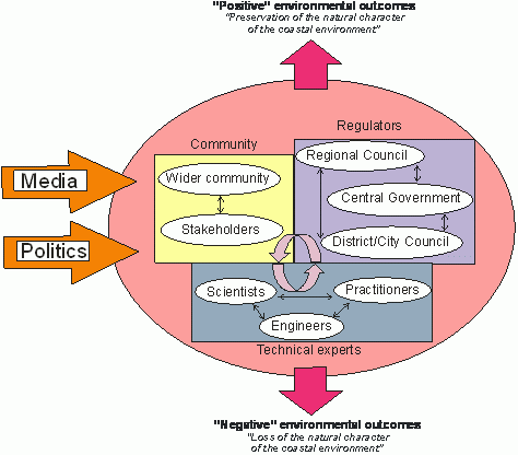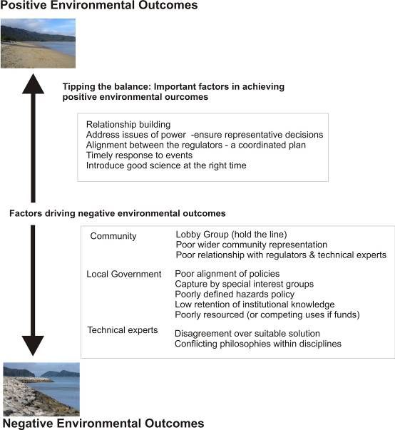 The relationships and interactions between, and within, the community, regulators and technical experts, and the extent to which contending interests can be satisfactorily resolved, shapes to a large extent the outcomes of efforts to address coastal erosion hazards. Although the context of each case study is different, a number of common themes emerge which determined the environmental outcome (see Figure 4).