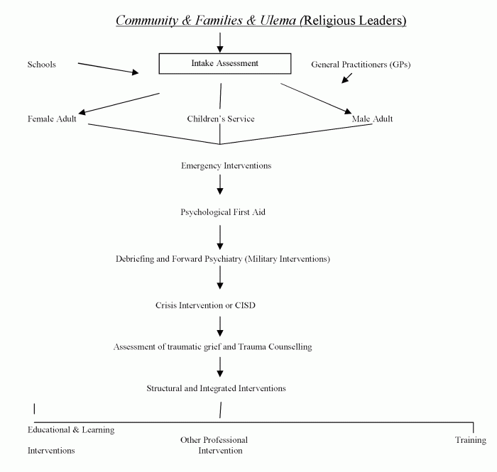 The proposed model integrates different agencies under one umbrella, to provide information and to create awareness, cater for immediate psychological aid, screen individuals for further appropriate intervention, and educate and update the mental health workers through training and workshops. This integrative strategy aims to promote confidence, social support and deep understanding of the different roles in a joint venture and a referral pathway would be created composed of family members, Ulemas (religious leaders), school teachers and general practitioners underpinning better coordination.